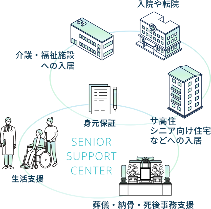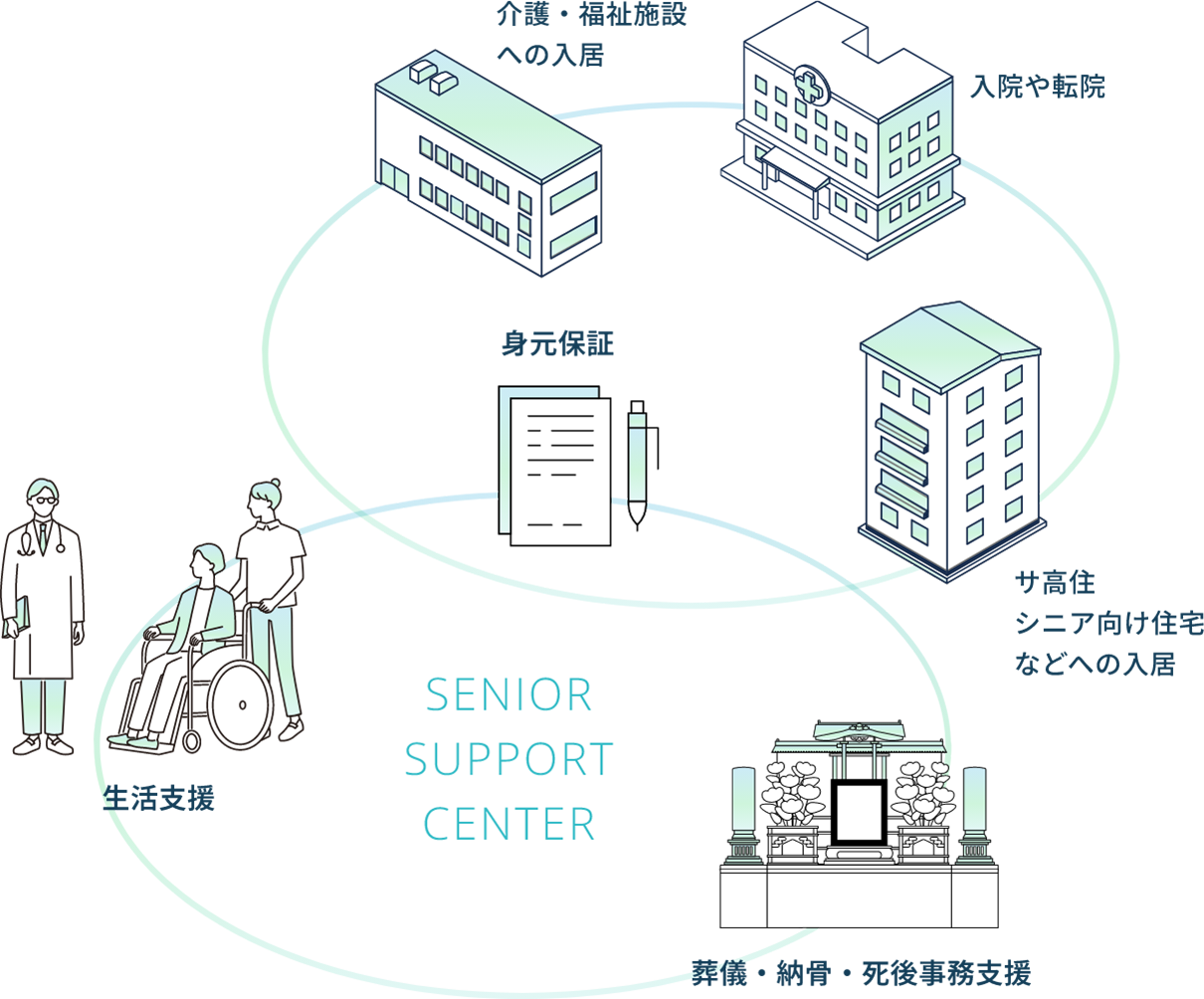 当法人は、入院する際や高齢者施設に入居する際の身元保証、介護保険ではサポートされない生活支援、財産管理や将来の判断能力の低下に備える任意後見、お亡くなりになった後の葬儀、納骨の手配など、ご依頼者の現在、将来、死後に渡るさまざまなご不安を解消するために、総合的な支援を行っています。