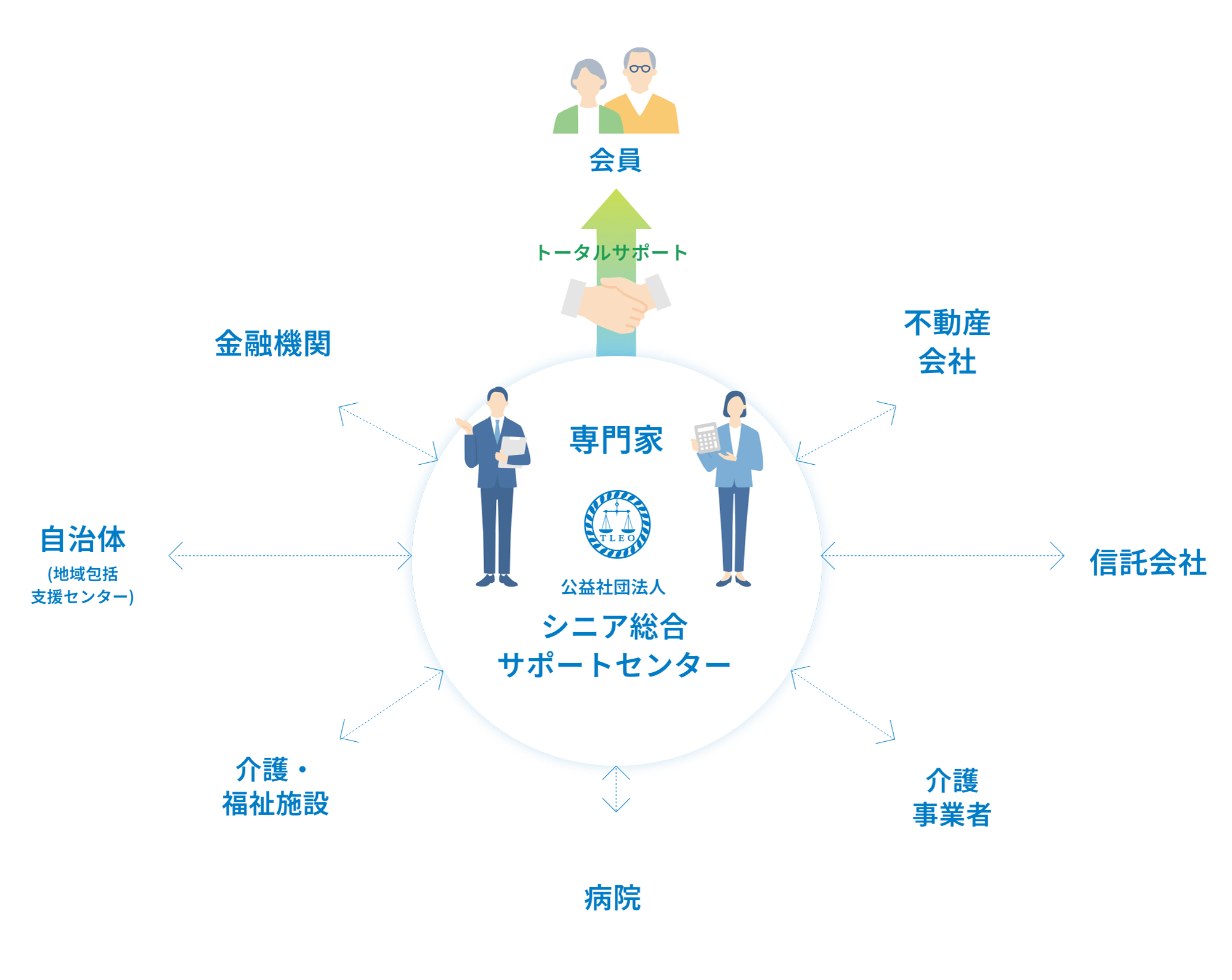 会員の皆さまをサポートするため、当法人は、ケアマネジャー、社会福祉士、行政書士等の専門家や介護福祉の分野での職務経験者を擁しており、シニアの方々と生涯にわたるお付き合いができる信頼関係を構築し、安心かつ質の高いサービスを提供します。