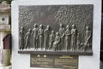この高野山の聖地の中で奥の院に通じる公園墓地に当法人の供養塔を建立しました。合祀墓ではなく供養塔を選んだのには理由があります。それは、そもそもお墓は不要との考えの方が増えている一方で、既に菩提寺があったり、個人的に納骨堂を用意していたりして合祀墓に納まらない方も相当数いらっしゃるという時代の趨勢があったからです。 また同敷地内に、当法人の理念である「共助」をテーマに彫刻家植田努氏が制作したレリーフも建立しました。