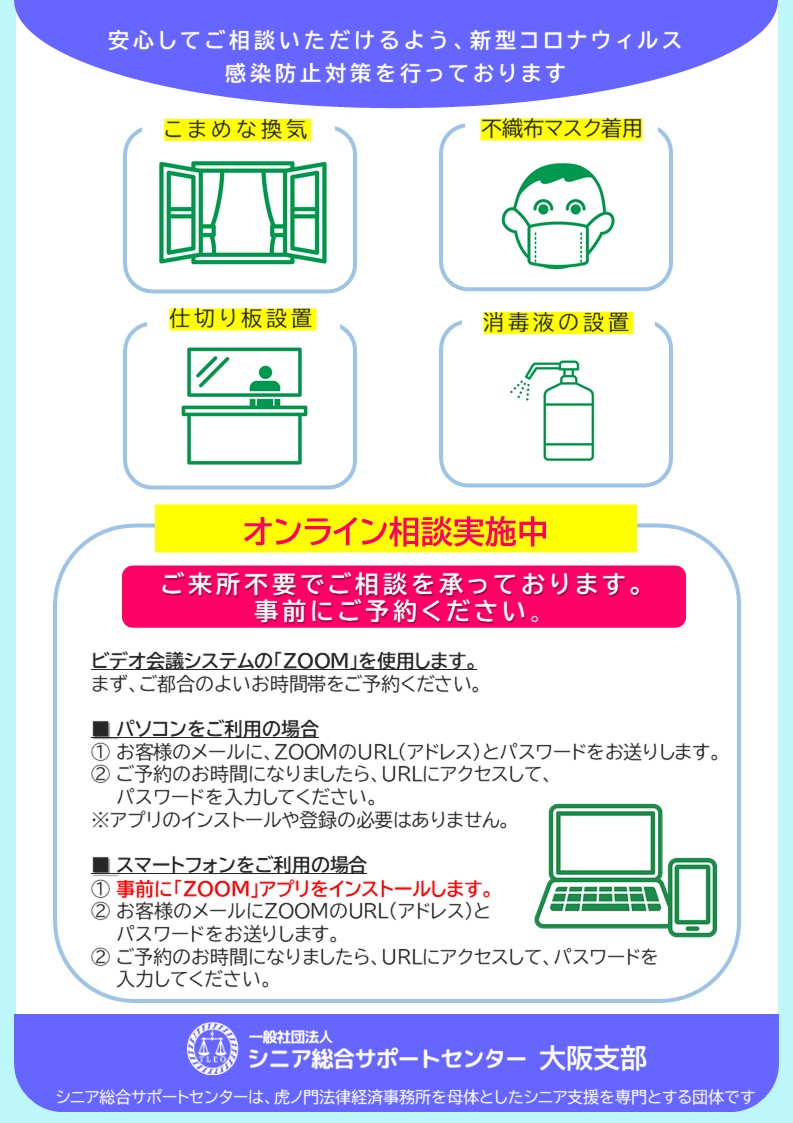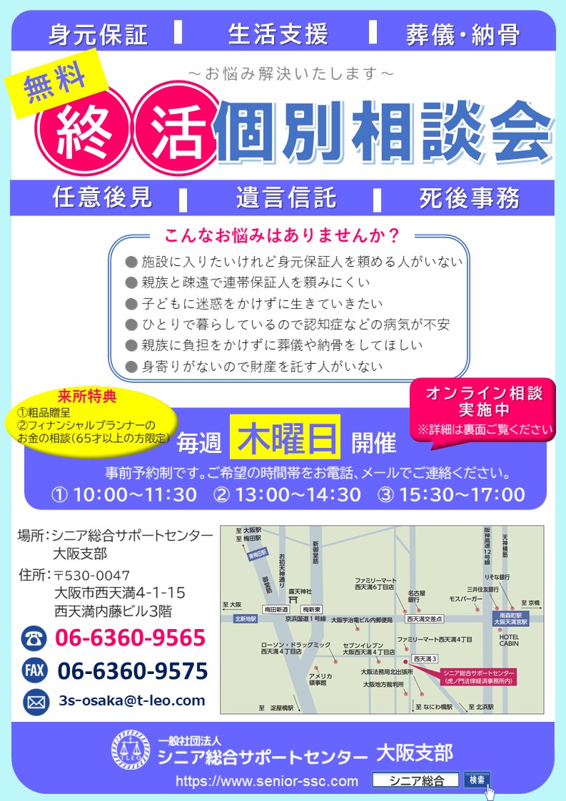 大阪支部では、毎週木曜日に「終活個別相談会」(事前予約制)を開催いたします。