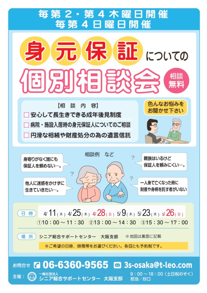 大阪支部では下記の日程で<身元保証><任意後見制度><遺言信託>に関する「個別相談会」(予約制)を開催します。