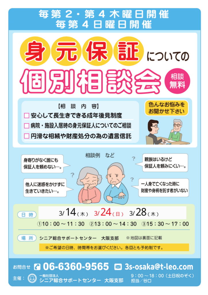 3月14日(木)、24日(日)、28日(木)に<身元保証><任意後見制度><遺言信託>に関する「個別相談会」(予約制)を開催します。