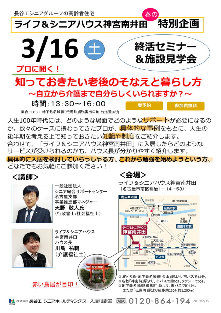 名古屋支部では来る3月16日(土)、株式会社長谷工シニアホールディングス様が運営する高齢者向け住宅「ライフ&シニアハウス神宮南井田」にて下記のセミナーを開催する運びとなりました。参加は無料です(要予約)。お気軽にご参加くださいませ。