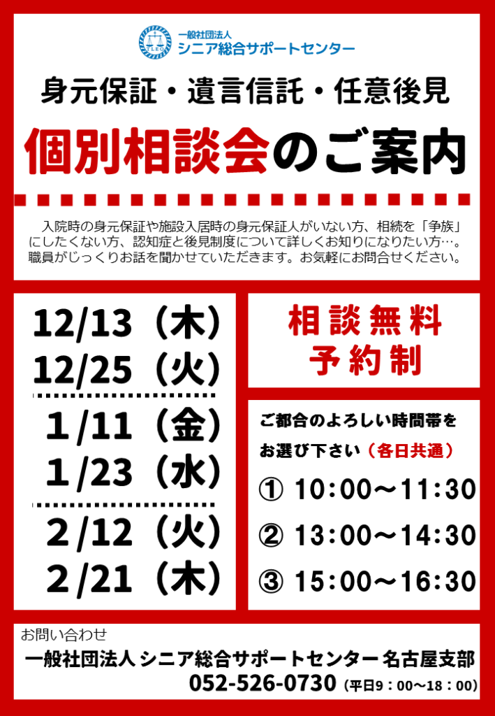 名古屋支部では下記の日程で<身元保証><任意後見制度><遺言信託>に関する「個別相談会」(予約制)を開催します。