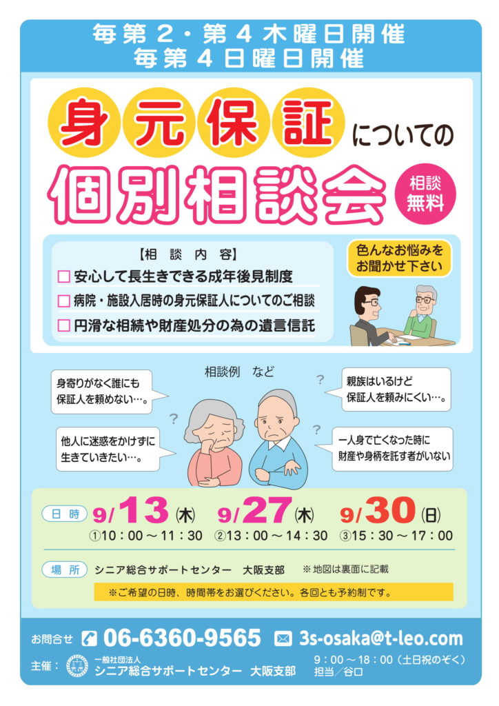 9月13日(木)、27日(木)、30日(日)に<身元保証><任意後見制度><遺言信託>に関する「個別相談会」(予約制)を開催します。