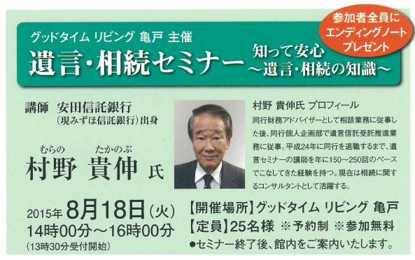 平成27年8月18日(火)グッドタイムリビング亀戸にて、当法人によるセミナーを開催いたしました。 元信託銀行アドバイザーの村野さんより、相続・遺言についての講演を頂戴し、実例も多くご紹介いただきました。 参加者の皆さまも熱心に耳を傾けていただき、大変盛況のセミナーとなりました。